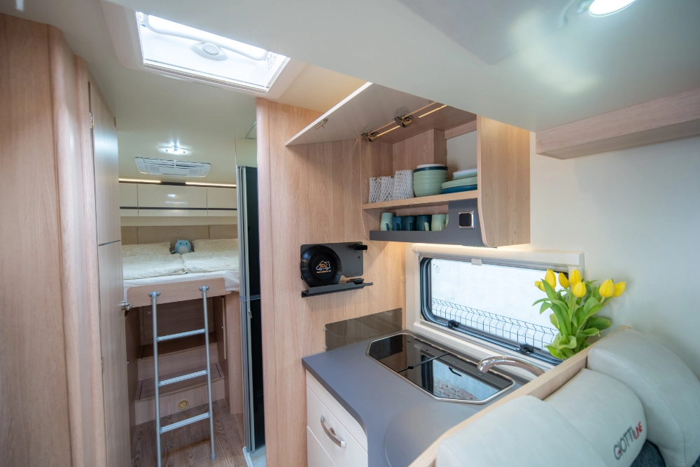 Priestranný, ideálny pre malú rodinu. Súčasť vybavenia sú kuchynské potreby, posteľná bielizeň a iné doplnky. Jednoducho moderný, pohodlný a spoľahlivý karavan.